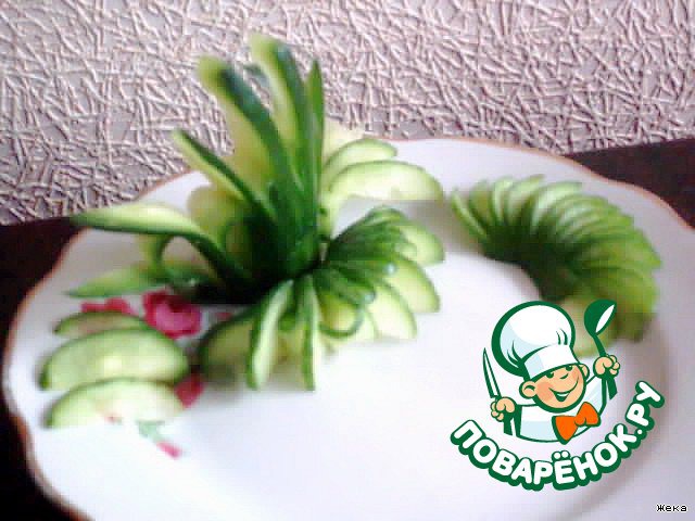 Часть огурца режем вдоль на лепестки. И проделываем вариант, который был. Получается в виде короны. И, комбинируя разные заготовки, создаем наше украшение.