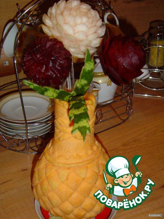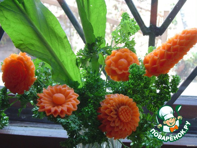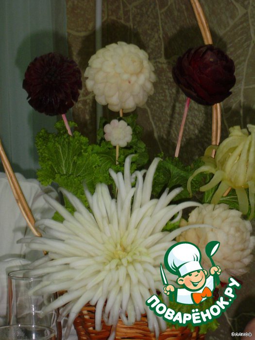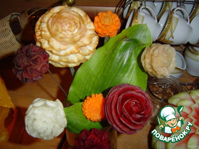 | Цветы из овощей, многие из которых уже были мною представлены, можно использовать как для украшения блюд, так и для составления букетов и композиций, которые украсят Ваш стол и удивят Ваших гостей!!! Я разбила эту рубрику на 2 части. Сначала будем составлять букеты |