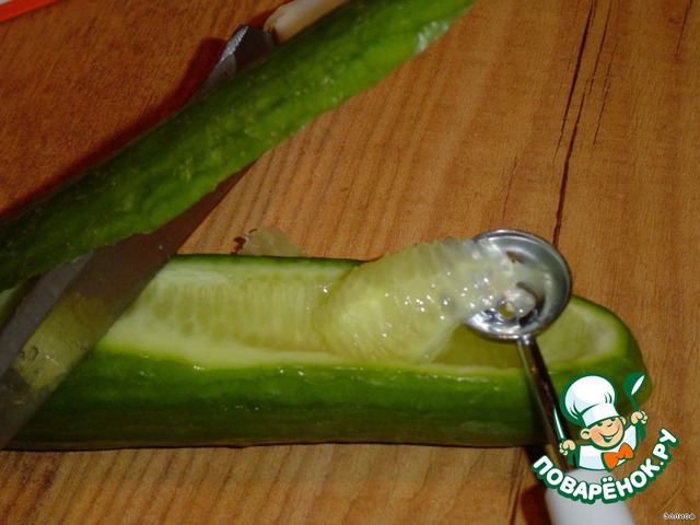 1. Отрезаем кожицу огурца вдоль, не до конца. Кожица должна быть такой толщины, чтобы оставалась гибкой.