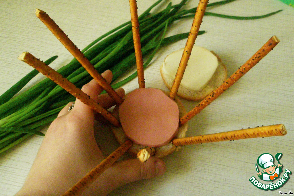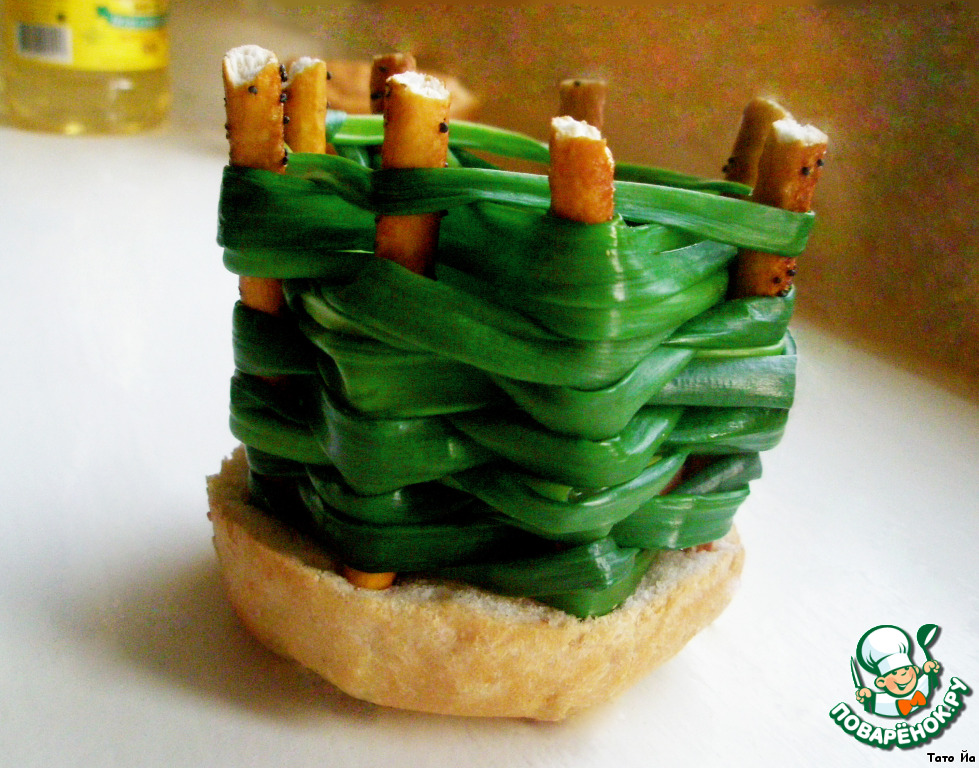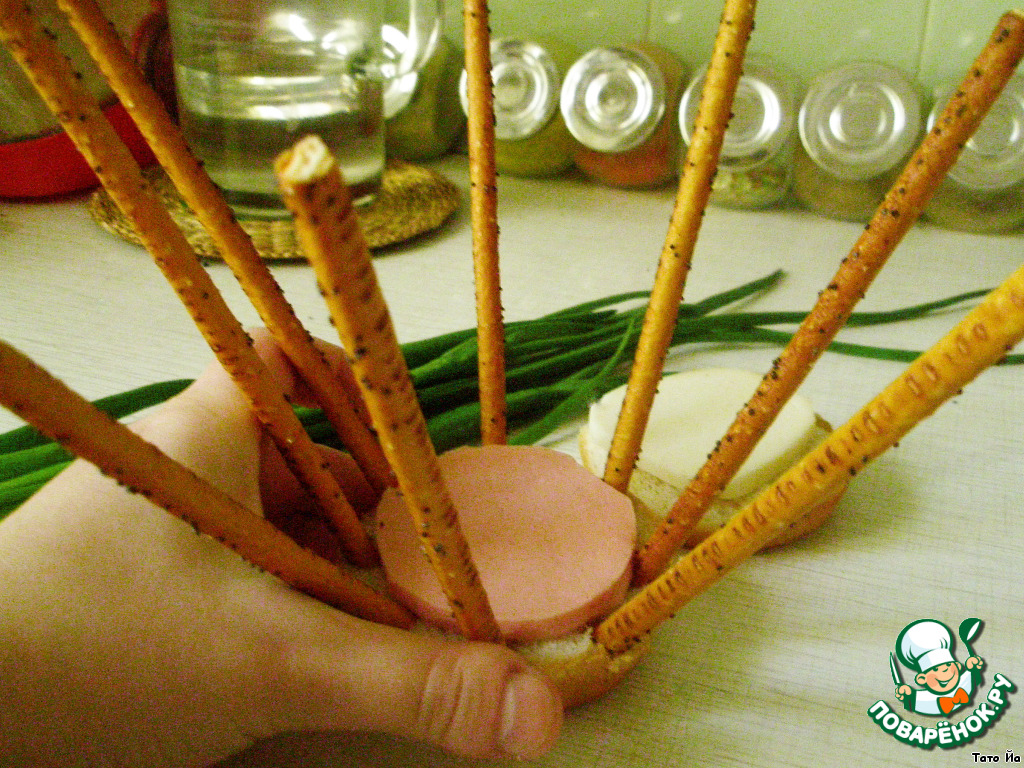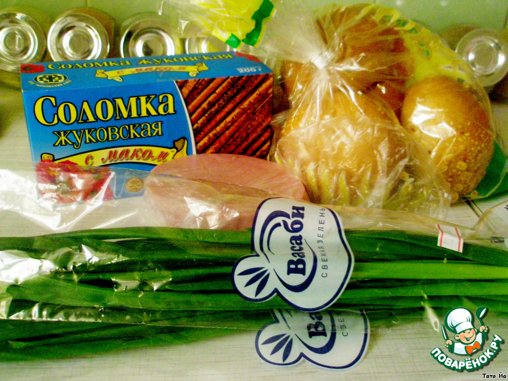 Необходимые ингредиенты: булочка, колбаса, соломка, ну и, конечно, зеленый лук!