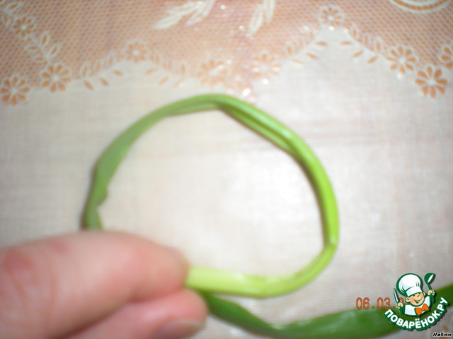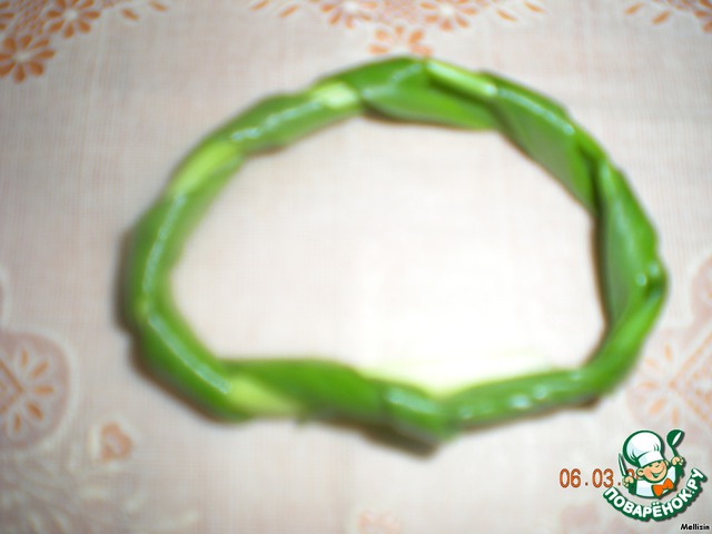 Делаем кольцо из лука. Если лук рвётся, то его можно обдать кипятком. Тогда он будет более податливым.