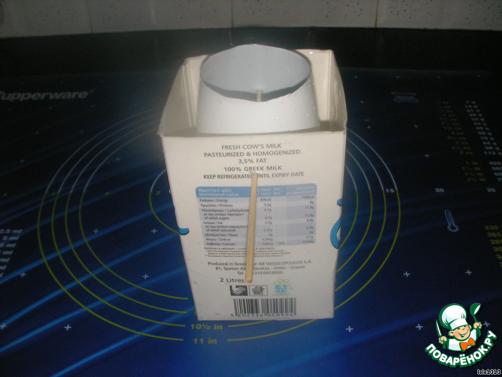 Отметить дырочки на упаковках (по 4 на каждой - крест на крест), причем на пластмассовой бутылочке дырочка должна быть на 1,5 см выше, чем на картонной упаковке, т.е дно будущей чаши будет именно 1,5 см.