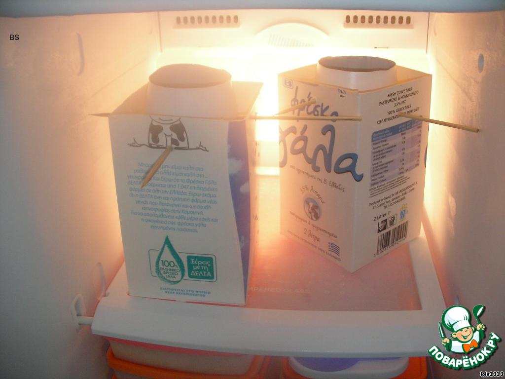 Наполнить создавшееся между двумя формами пространство водой и поставить в морозильную камеру (я оставила на ночь).