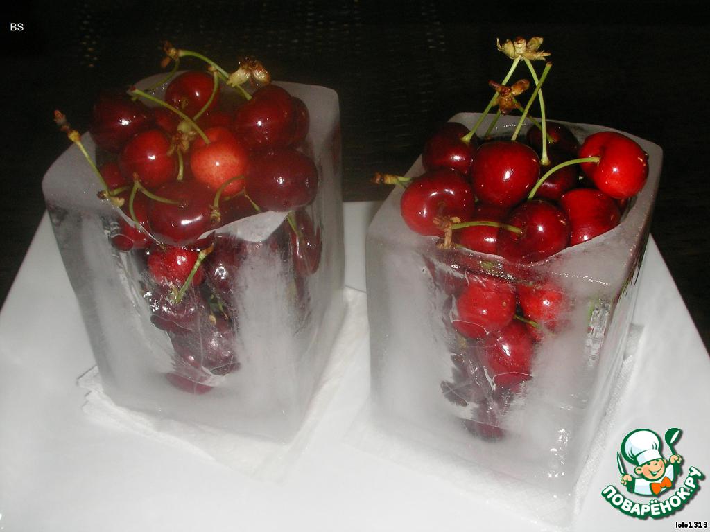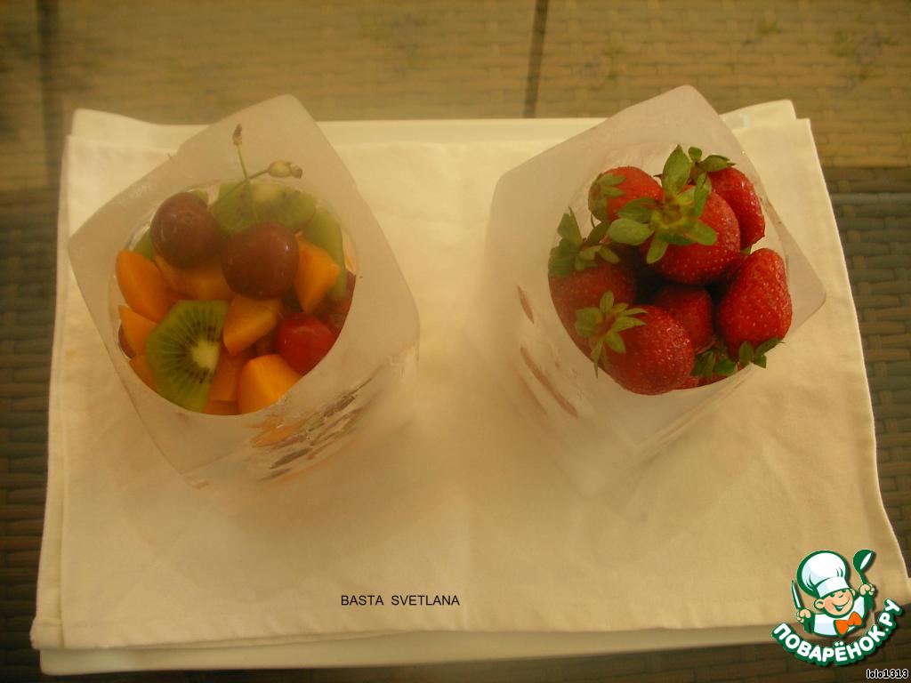На поднос выложить льняную ткань (по мере таяния ткань впитает воду), на ткань расположить чаши из льда, наполненные Вашими любимыми фруктами и ягодами.