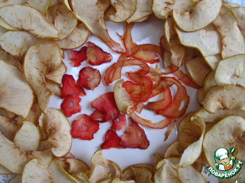 Нарезаем яблоко, помидор и клубничку ломтиками толщиной 1-2 мм. Промакаем салфеткой лишнюю жидкость и выкладываем наши ломтики на пергамент. Сушим в духовке при температуре 60 градусов до полного высыхания. Постоянно заглядываем, чтоб не сгорели. Можно перевернуть один раз.