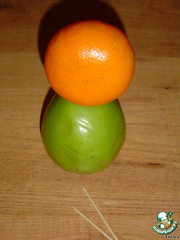 два кружочка зубочистками прикрепляем в центральной части мандарина,