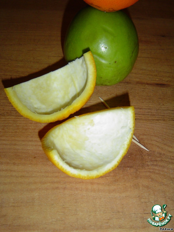 Апельсин разрезаем на две части, одну откладываем, а вторую половину режем пополам, убираем мякоть.