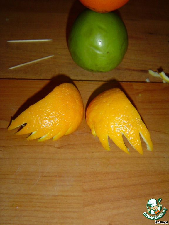 Из кожуры апельсина вырезаем два небольших треугольника,