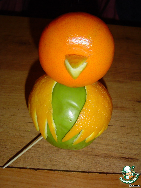 Лапки вырезаем из моркови или кожицы апельсина, крепим их с помощью зубочисток к нижней части яблока.