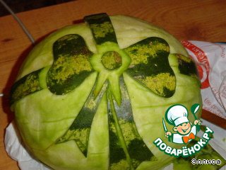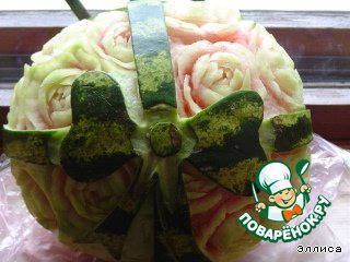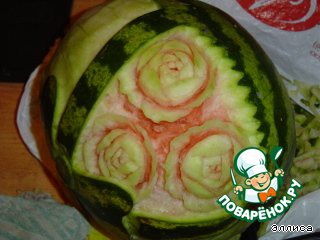 | Этот арбуз представляет собой подарочную корзину с цветами. До Нового Года осталось несколько дней. Кто-то будет отмечать его дома, а кто-то пойдет в гости. Но в любом случае лучшим подарком может быть этот арбузик. А как приятно будет съесть его в новогоднюю ночь!!! И подарок и десерт - два в одном! |