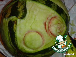 1. Берем арбуз и наносим на него рисунок ленты с бантом