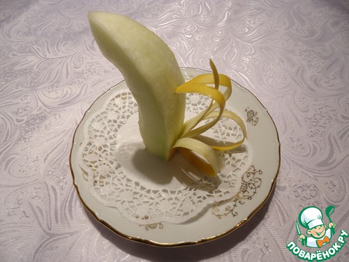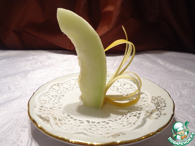 Очень просто приготовить следующий вид украшения из дыни. У дольки с двух краев делаем надрезы в мякоти до кожуры, отступив от концов примерно 2-3 см.