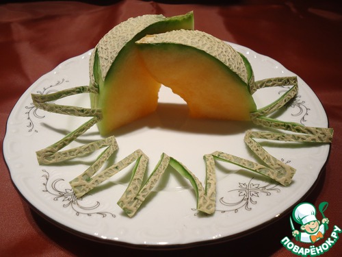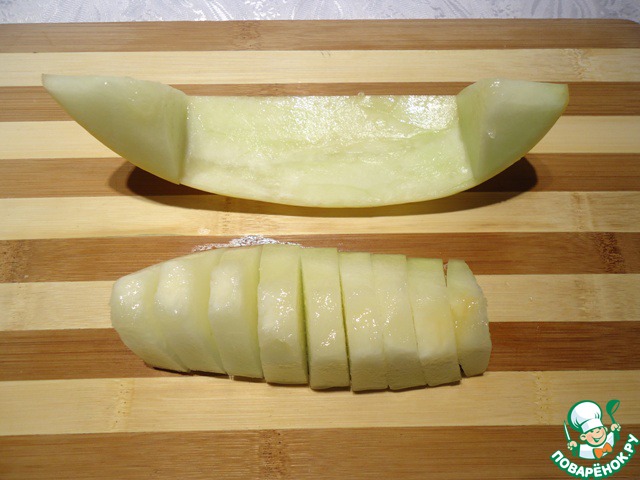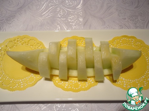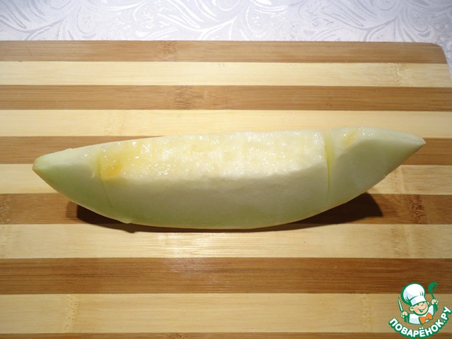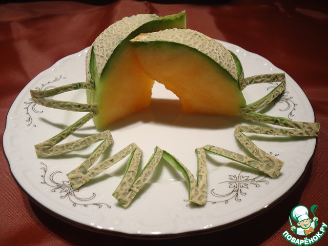 Затем ножом делаю надрез на кожуре, не доходя до края 0,3 см, следующий надрез делаем, перевернув дольку дыни, и т. д. Нужно будет потом приподнимать мякоть, чтобы сделать как можно больше надрезов.