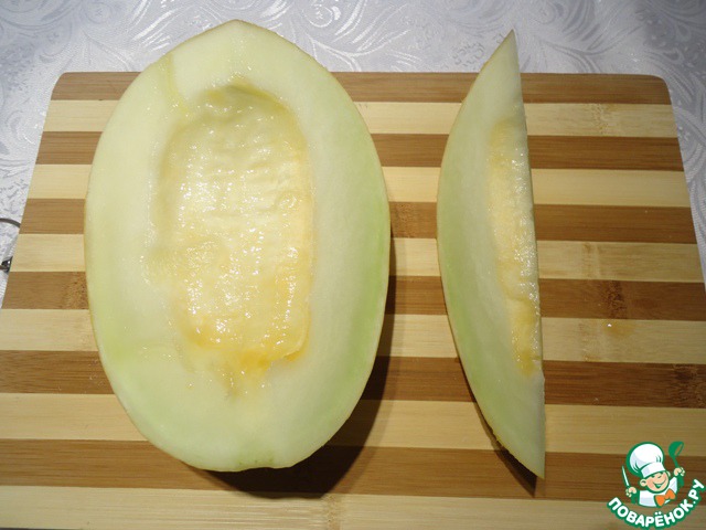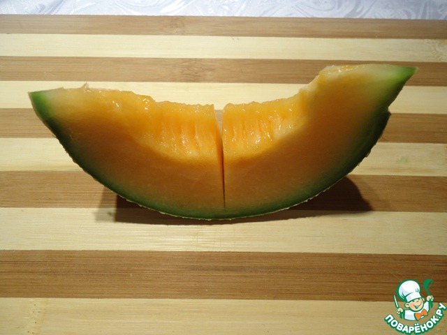 Дыню мою, разрезаю пополам, удаляю семечки. Отрезаю дольку.