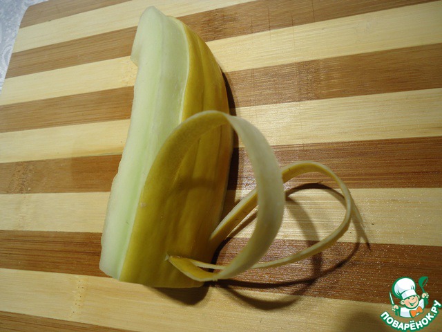Тонким ножом аккуратно отрезаем кожуру у дыни, не доходя до конца где-то 1,5 см.