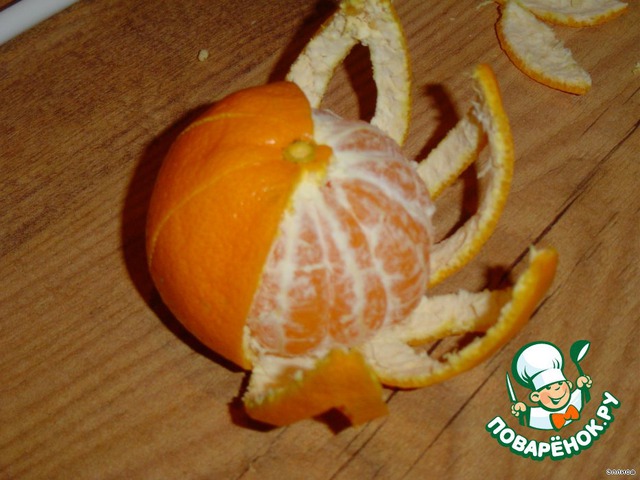 1. Кончиком ножа делаем на кожуре мандарина неглубокие царапины, разделив таким образом его на 6 частей.