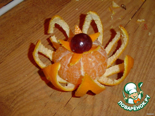 4. Мелкие вырезанные лепестки собираем в цветок и вставляем в верхушку мандарина.