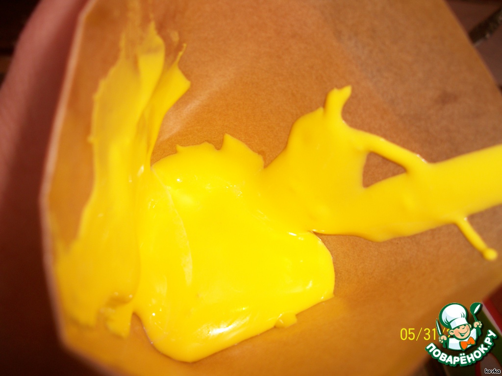 Выкладываем массу в бумажный корнетик, верх заворачиваем и делаем маленькое отверстие.