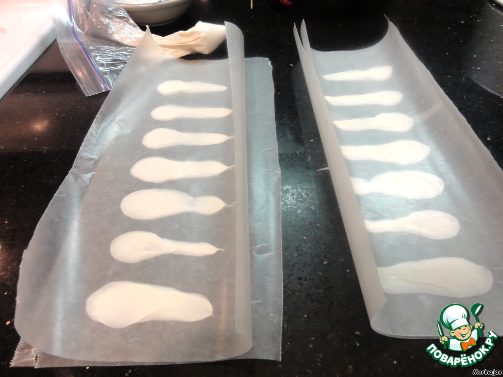 На пакетике с шоколадом сделать надрез и нанести на кальку полоски шоколада, сужающиеся книзу.