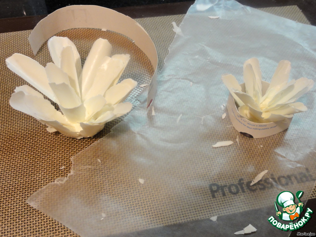Достаем из холодильника и аккуратно отделяем шоколадные лепестки от кальки.