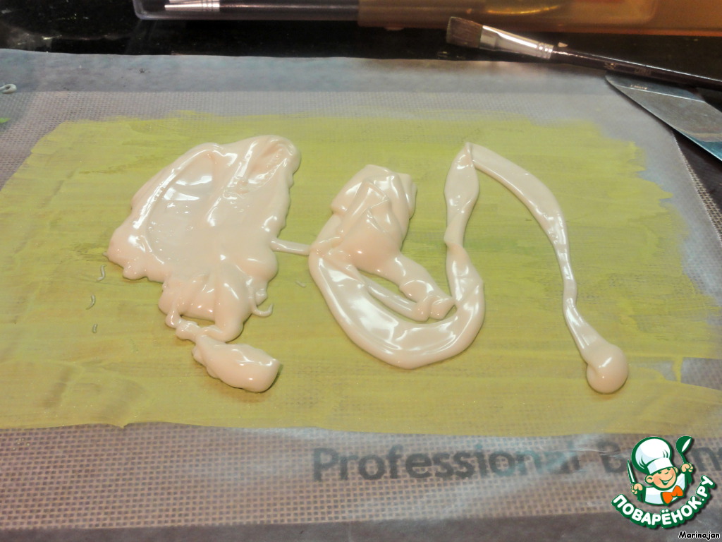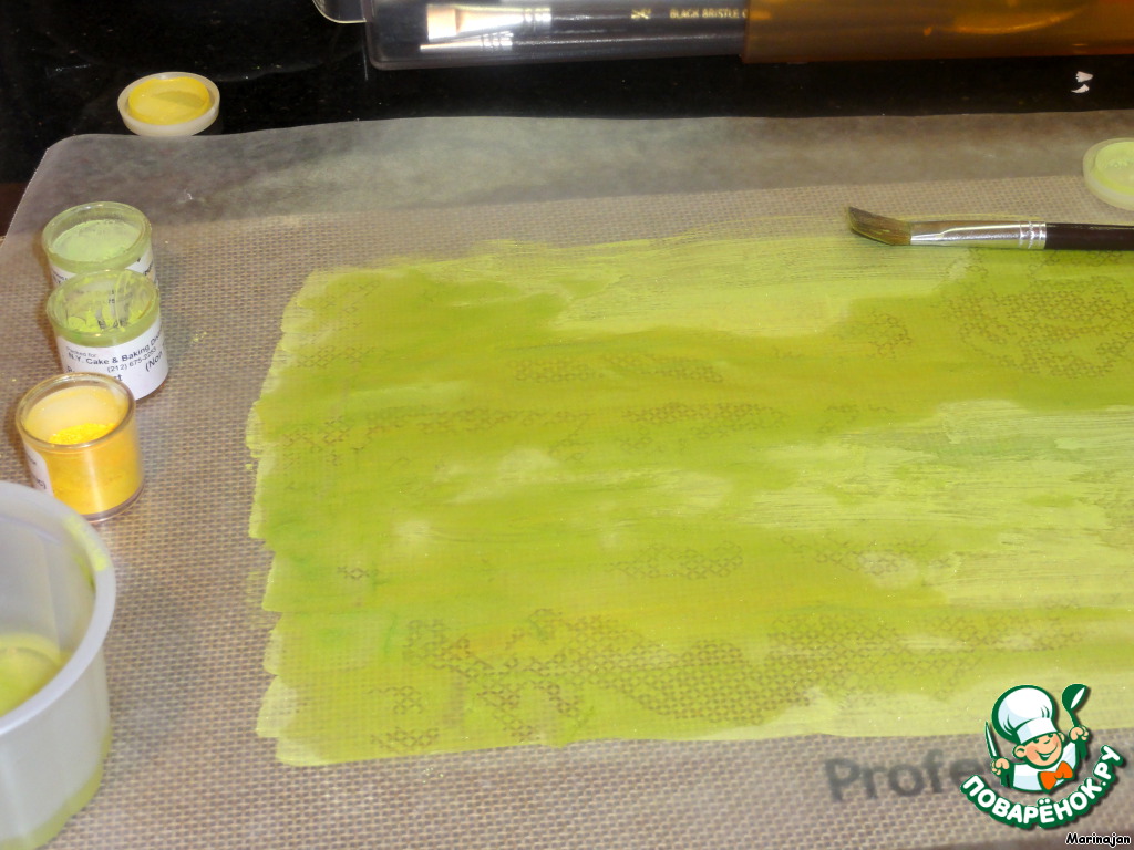 На кальку кисточкой наносим пищевой краситель, разбавленный в спирте.