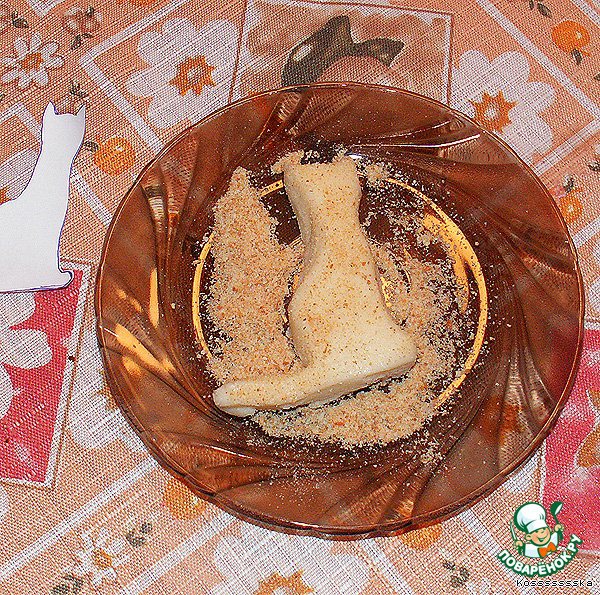 Кладем на посыпанное сухариками блюдце, посыпаем сверху (это чтобы не таял в руках и для придания фактуры).