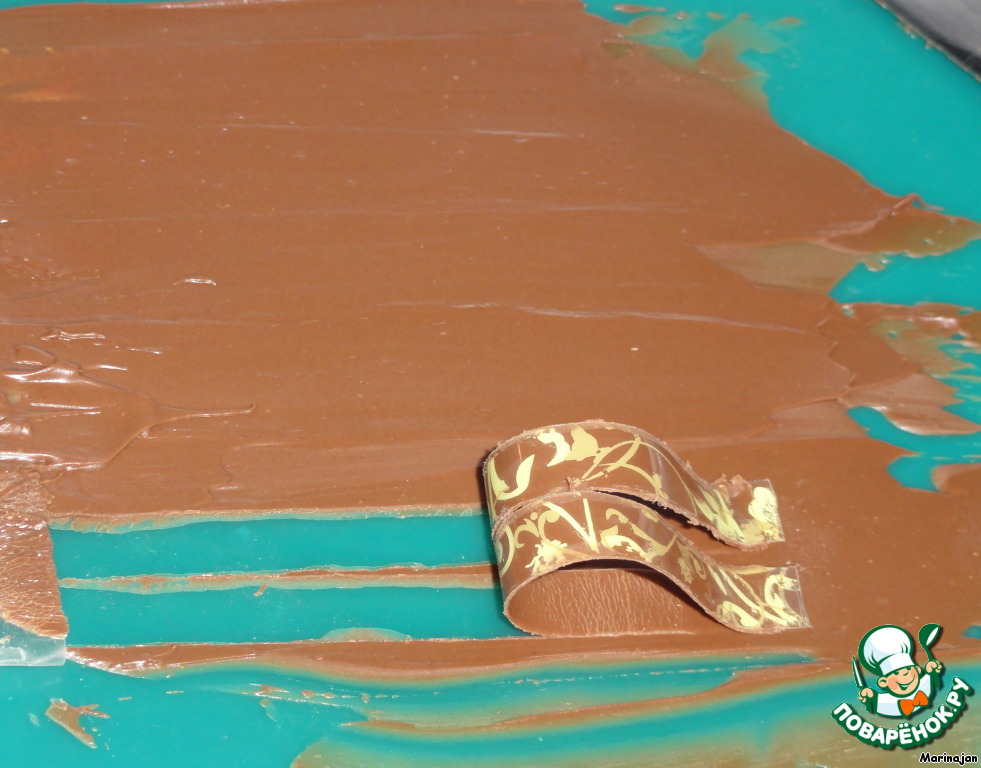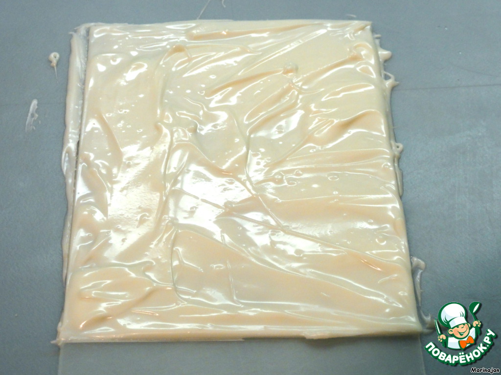Налить растопленный шоколад на лицевую сторону плёнки, осторожно размазать тонким слоем (примерно 1,5 мм), дать возможность слегка остыть.