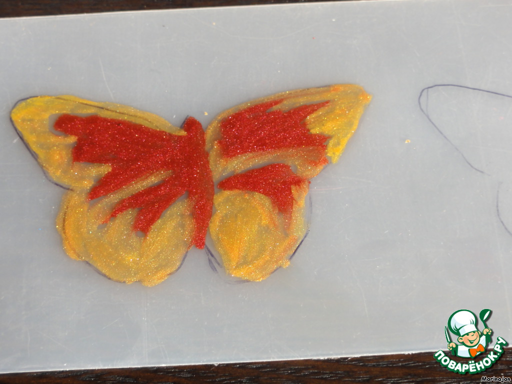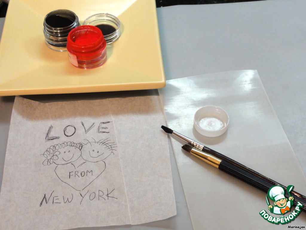 Мы должны получить зеркальное изображение, поэтому под пластик рисунок переворачиваем и наносим кисточкой сухие пищевые краски, разбавленные в спирте или в водке.