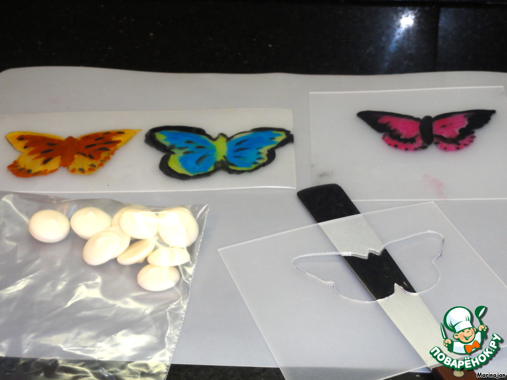 | Переводные картинки на шоколад служат для нанесения красочных рисунков на поверхность шоколада. Они есть в продаже, но их можно нарисовать самим. Это придаст Вашему торту или пирожному оригинальность и неповторимость. Вот, что у меня получилось. |