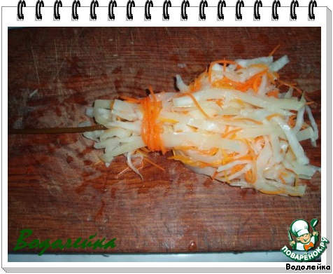 Единственное что, это капусту нужно нашинковать длинными полосочками, а морковь и тыкву натереть на терке для корейской морковки. Согласитесь, так нам намного удобнее будет делать "метлу".