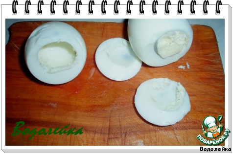 Отварные яйца (у меня было 6 шт.) почистить и срезать немного снизу, для стойкости яиц (не по середине, как мы обычно это делаем).