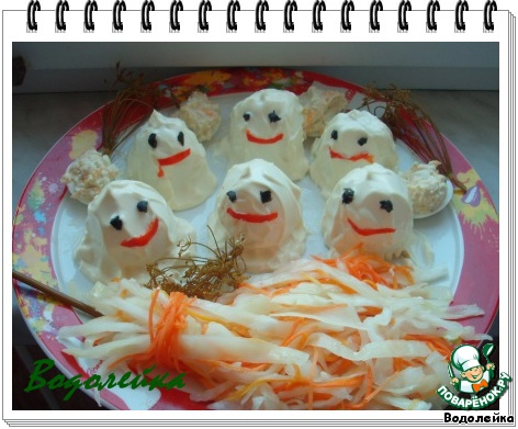 | Я понимаю, что праздник хэллоуина уже прошел, но не получилось у меня скинуть рецепт. Уж простите меня. Но ведь так оформить блюдо можно не только на хэллоуин, а на любой другой праздник или день рождения. |