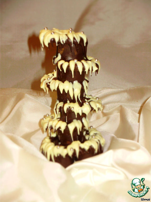 Начинаем собирать шоколадную фигуру: на шоколадную формочку укладываем шоколадный диск (склеиваем с помощью шоколада), в такой последовательности делаем до шести этажей.