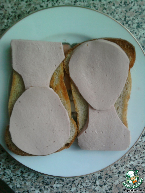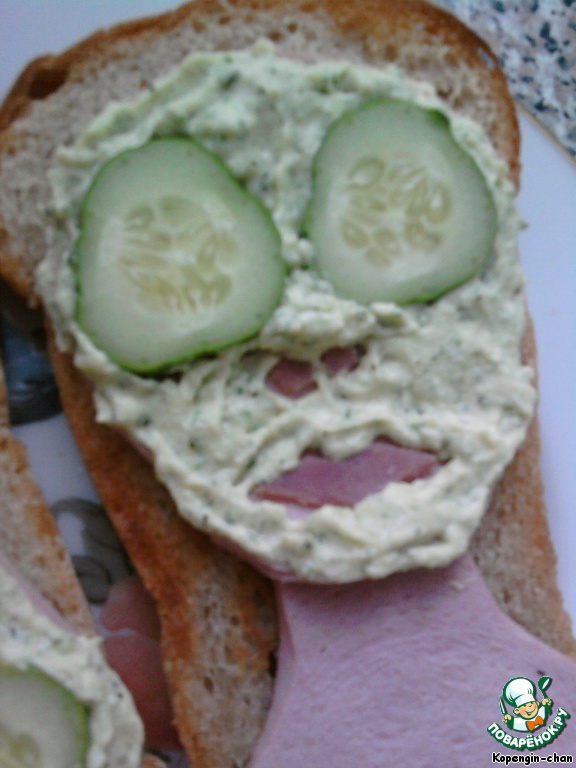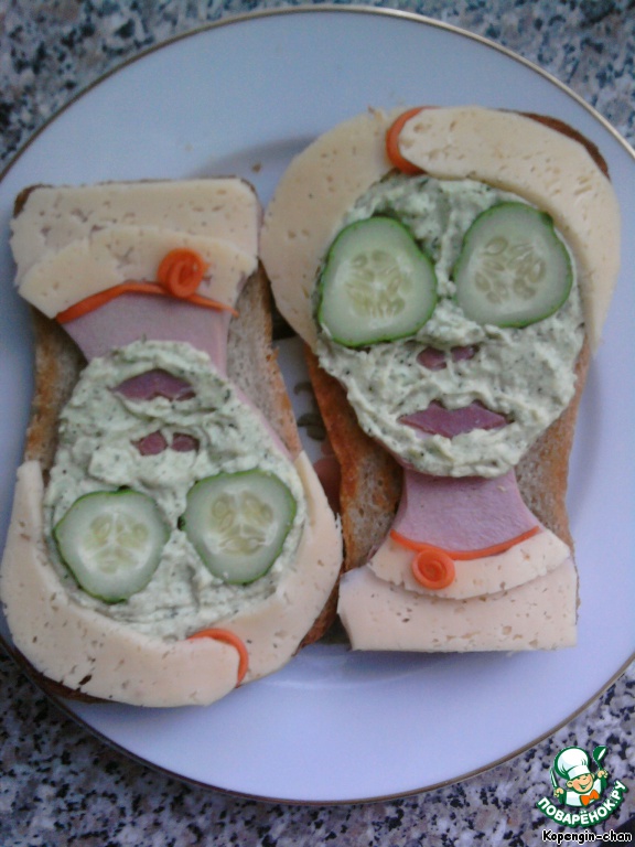 | Вот таким нехитрым способом можно позабавить подруг и... напугать мужа, если нужно. Количество продуктов я не пишу, там всего по чуть-чуть надо. А вообще очень удобно делать этот бутерброд, когда готовишь "Оливье", кроме сыра в нем все есть. Так что не поленитесь и сделайте такую развеселую штуку! Идею наша в Интернете, только там это был бенто. |
