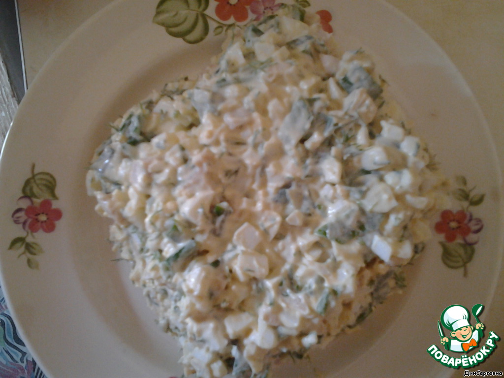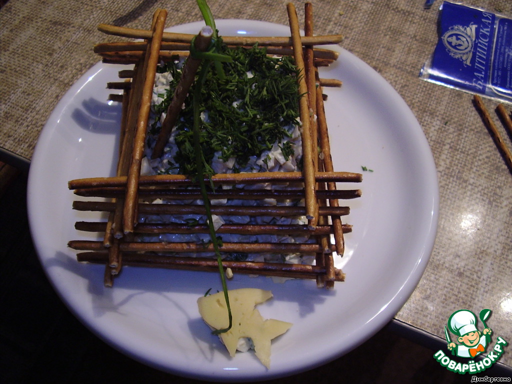 Берем готовый салат - у нас был из кальмаров, яиц и зеленого лука, заправленный майонезом. Пытаемся выложить более-менее ровно в форме куба. С размерами определяемся исходя из длины соломки.