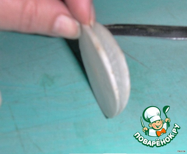 Тонко срежьте наружную часть овоща, не отрезая её до конца.