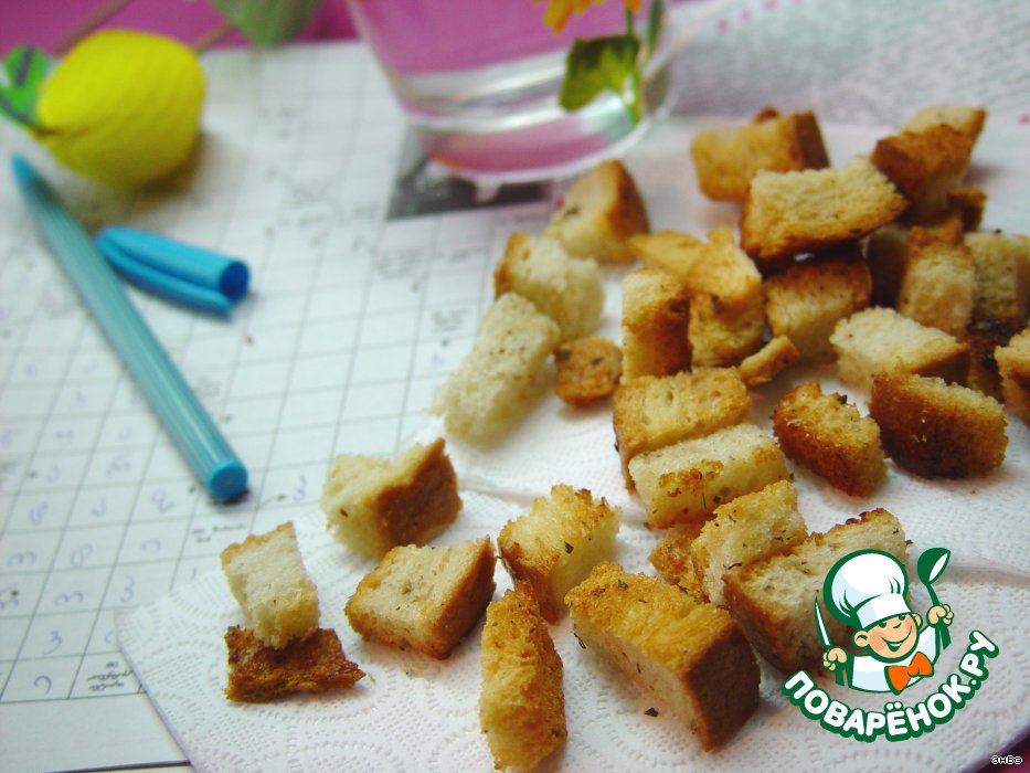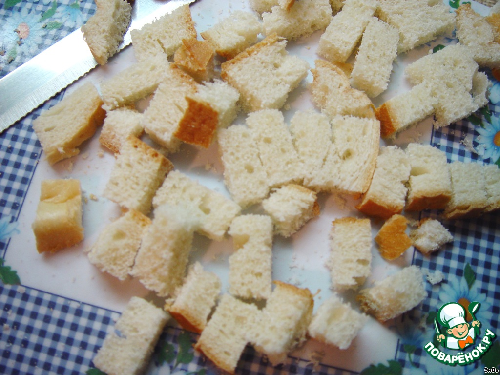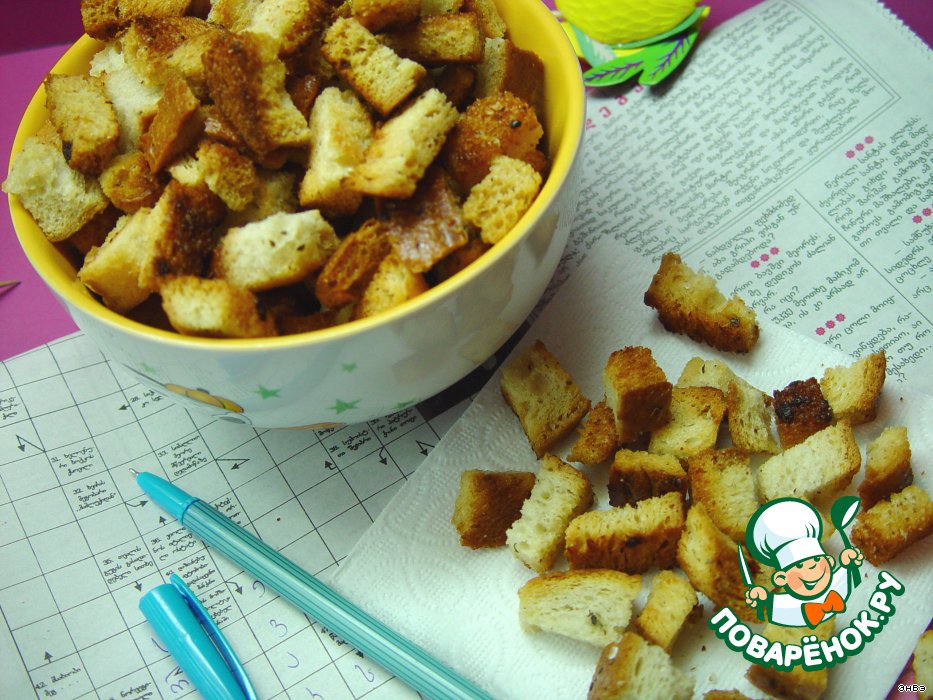 На сайте есть рецепты сухариков, в этом я не оригинальна, но рецепта с таким способом приготовления я не нашла, а способ этот помогает распределить "смазку" равномерно, со всех сторон и на всех кусочках.