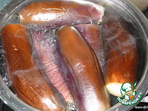 Вынуть синенькие из воды, дать остыть. Когда остынут, сделать посередине надрезы, не до конца, уложить на тарелку, придавив небольшим грузом, оставить на 30-40 минут.