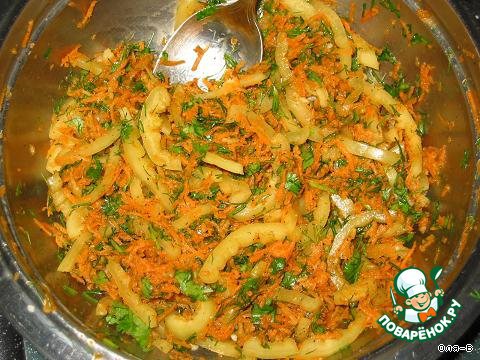 В это время, потереть морковь и чеснок на мелкую терку, перец порезать тонкими полукольцами, зелень измельчить, добавить к овощам 1 чайную ложку уксуса и растительного масла, по щепотке соли и сахара, немного острого перца, хорошо перемешать овощи.