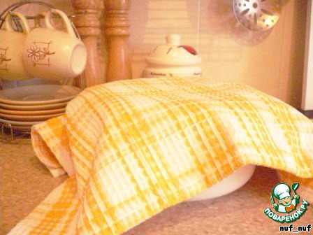 Плотно закрыть крышкой или пищевой плёнкой чашку с тестом. Накрыть полотенцем и поставить в тёплое место на 40-45 мин. Тесто должно подойти два раза.