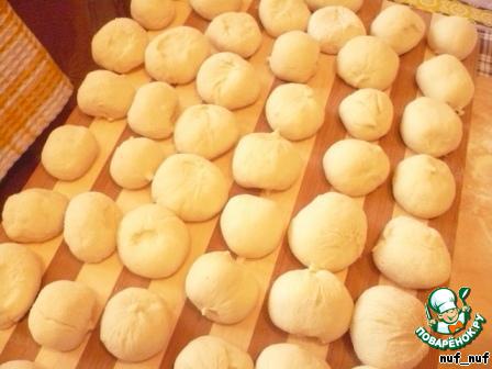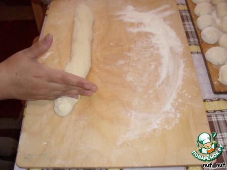 Ребро ладони обсыпать мукой и, совершая поступательные движения, отделить небольшие кусочки размером с грецкий орех.