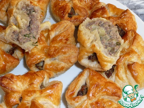 | Девочки прошу прощения, выставляю потерянный рецепт. Он был размещен 22 мая 2014г. Спонтанно получилось вкусное блюдо. Сегодня по телевизору увидела приготовление паштета из грибов в слоеном тесте. Так понравилась идея, но к сожалению грибов дома нет, но были куриные желудочки. Решила приготовить с ними. Идея прекрасная, все просто и быстро. Выпекала паштет в аэрогриле (у нас очень жарко и гонять духовку при + 30 град. не осмелилась), но можно готовить и в духовке. |