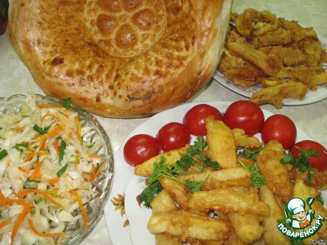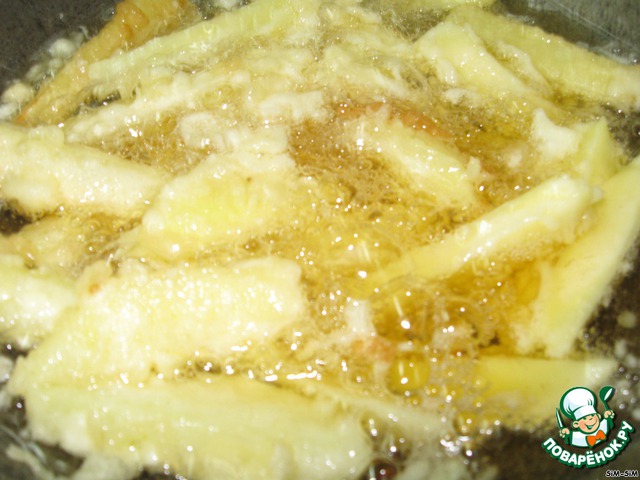 Раскалить масло в казане или глубокой сковороде. Картофель обмакивать в тесто и бросать в кипящее масло, накрывая крышкой, чтобы не брызгало. Жарить на среднем огне, чтобы картошечка прожарилась...