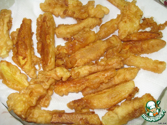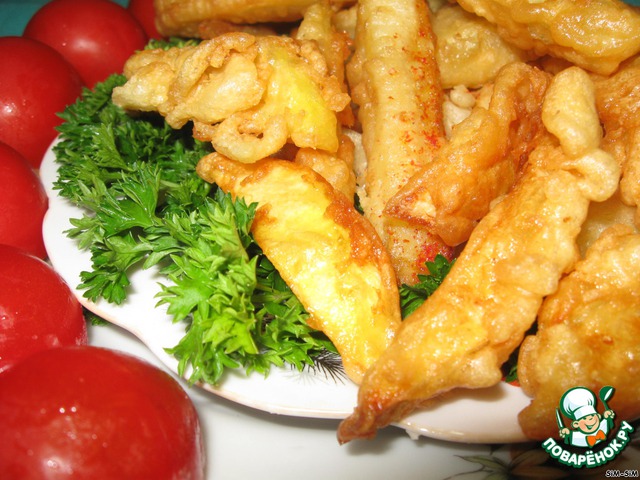 Подготовить кляр: развести муку в воде(я добавила яйцо) до консистенции густой сметаны , немного посолить.
