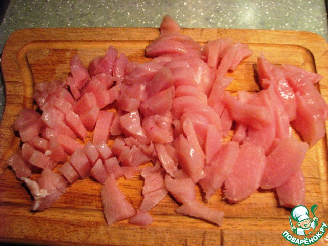 Нарезаем курицу небольшими кусочками, сбрызгиваем слегка растительным маслом и оставляем немного промариноваться.