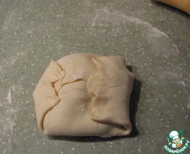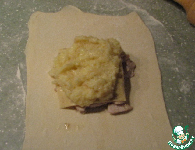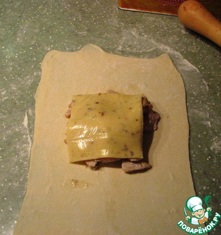 Начинка готова, тесто разморозилось, начинаем формировать наши конвертики.