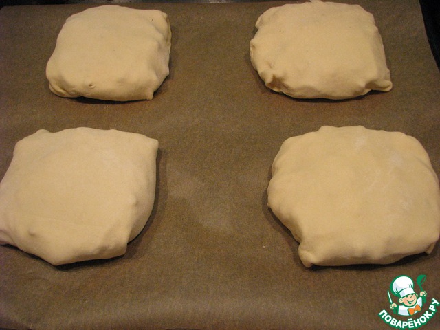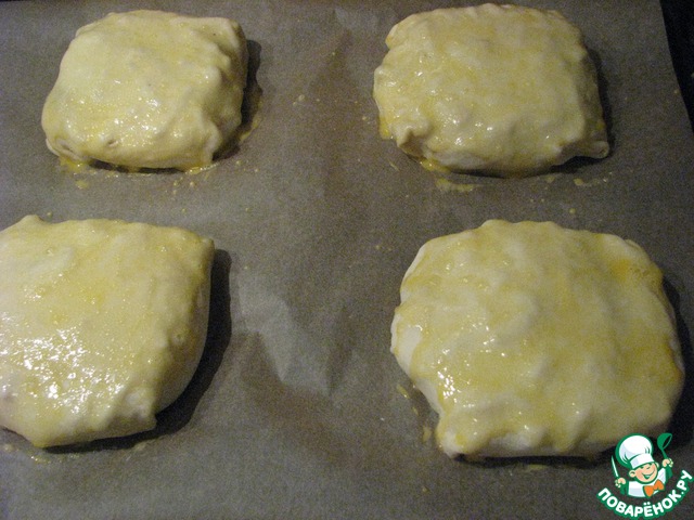 Смазываем верх яичным желтком и ставим выпекаться в заранее разогретую до 180 градусов духовку.