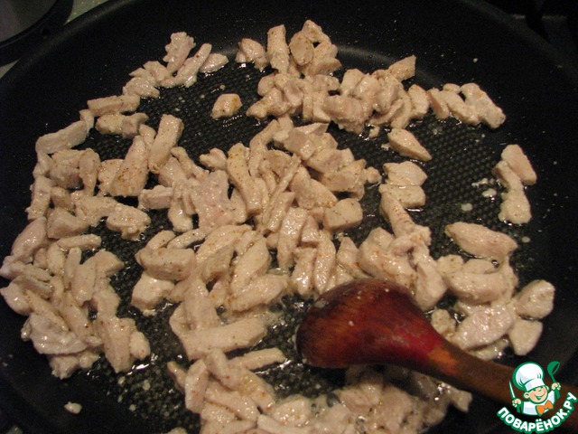 Готовим очень быстро, не пересушиваем, курица должна остаться сочной, ведь ей же еще предстоит пребывание в горячей духовке.