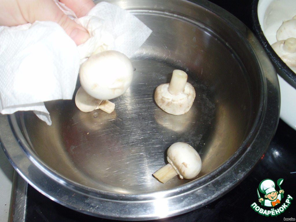 Шампиньоны ополоснуть водой и протереть шапочки.