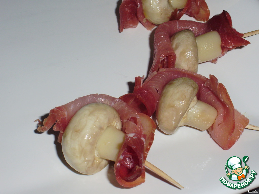 Надеть на зубочиску ветчину с грибочком.